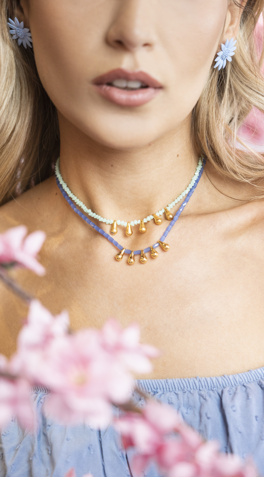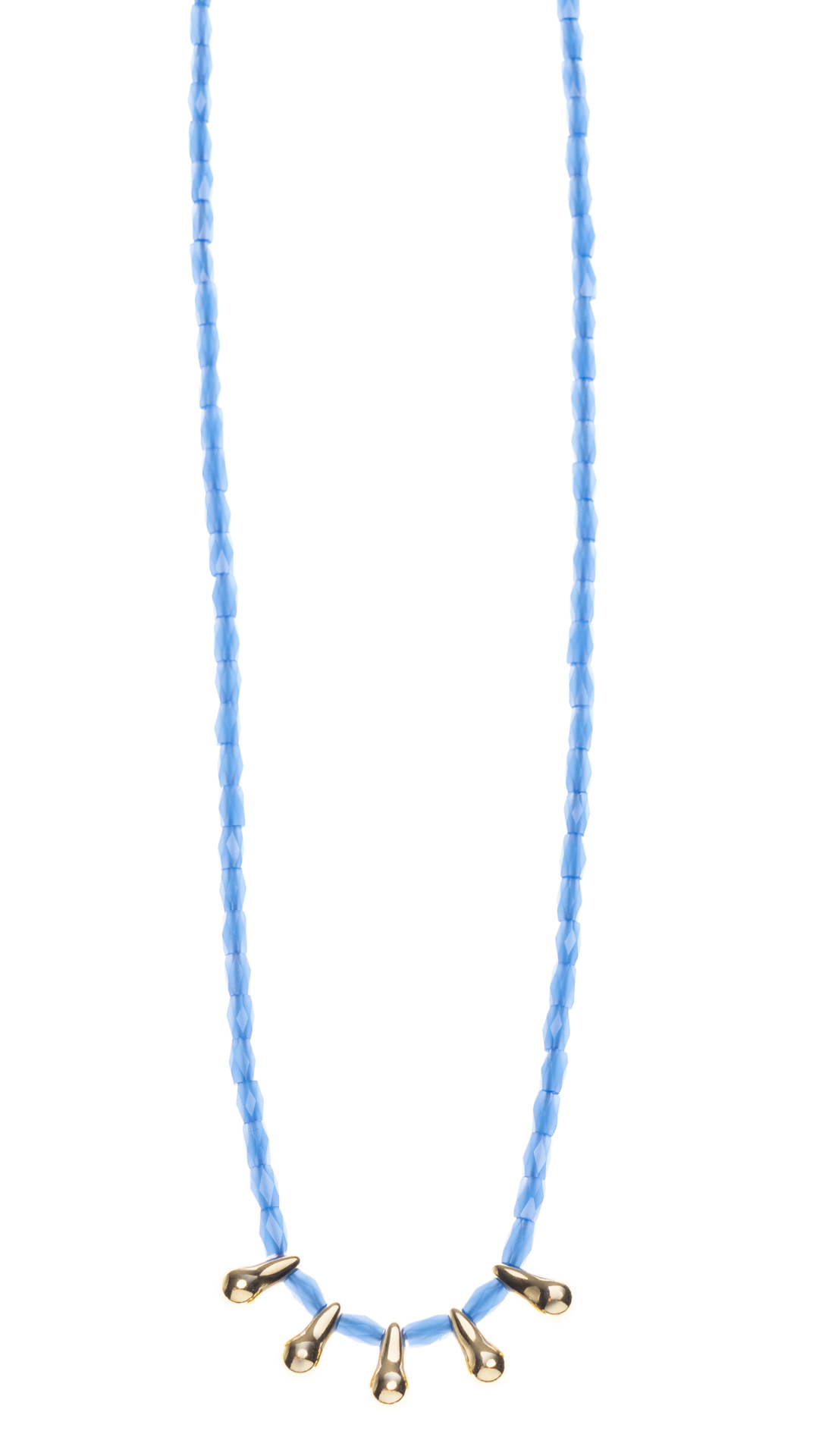 Χειροποίητο κολιέ 40-50cm με μπλε γυάλινη χάντρα σωληνάκι και ορειχάλκινα επιχρυσωμένα περαστά στοιχεία σε σχήμα σταγόνα.