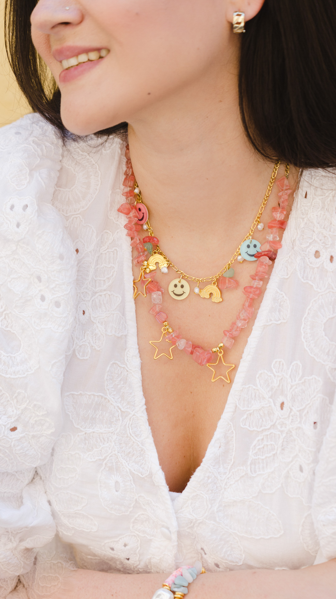 Χειροποίητο κολιέ 45-50cm με ημιπολύτιμες πέτρες-τσιπς , ορειχάλκινα επιχρυσωμένα στοιχεία αστέρια και ατσάλινη επιχρυσωμένη αλυσίδα.